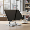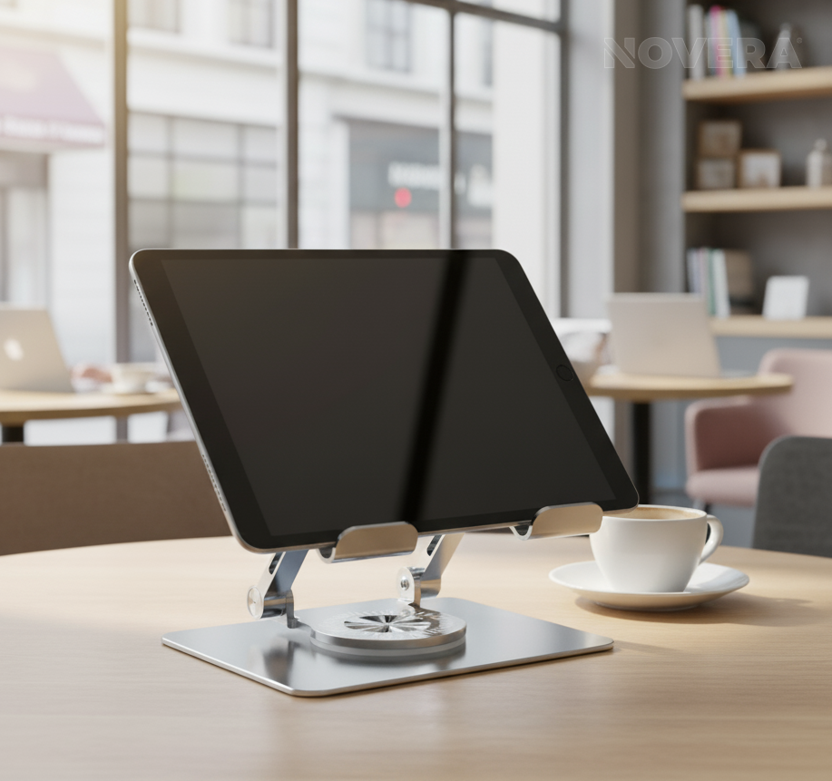 soporte de aluminio con base giratoria. Diseñado para ofrecer estabilidad, comodidad y un ángulo de visión ajustable, es ideal para trabajar, estudiar, ver películas o hacer videollamadas sin necesidad de sostener tu dispositivo.